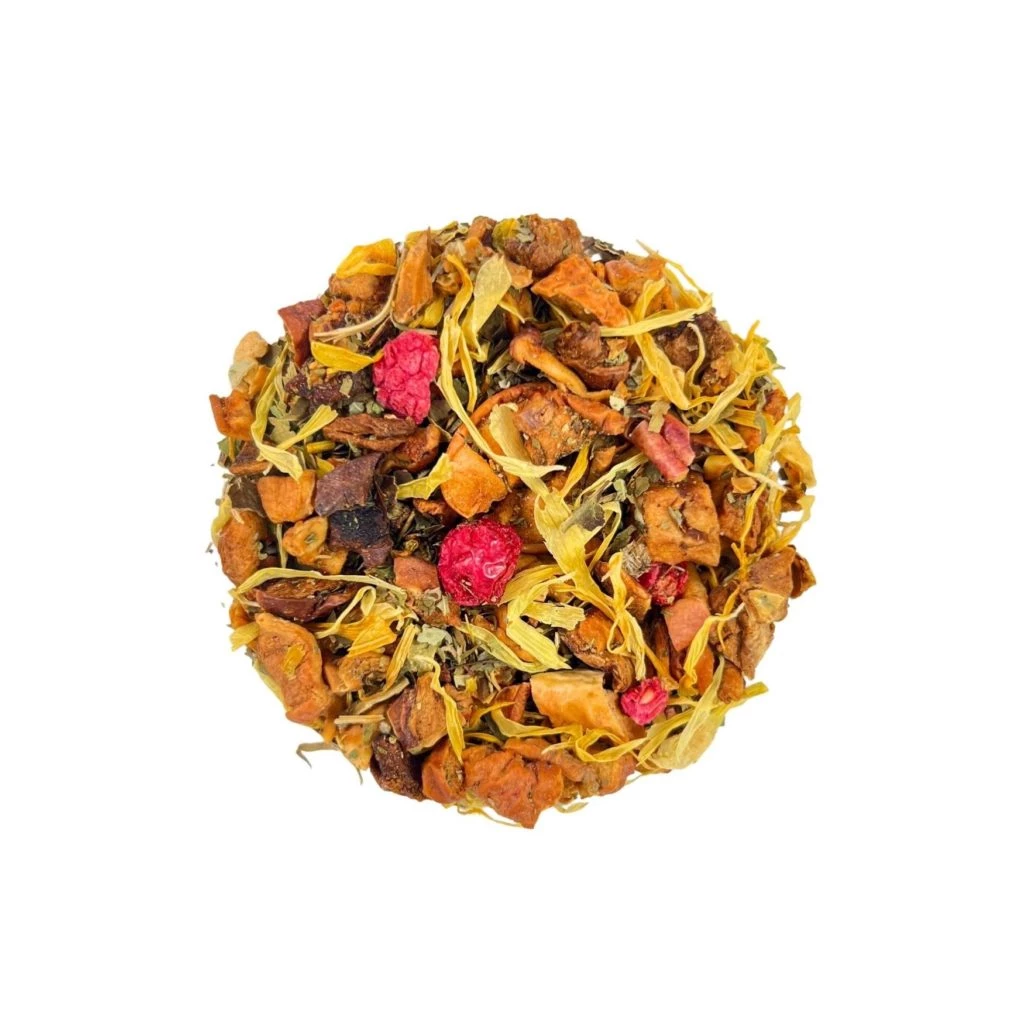 Pomme, arôme naturel, rooibos vert, orange, verveine, feuilles de murier, fleurs, cranberries, groseilles rouges et noires, framboises.