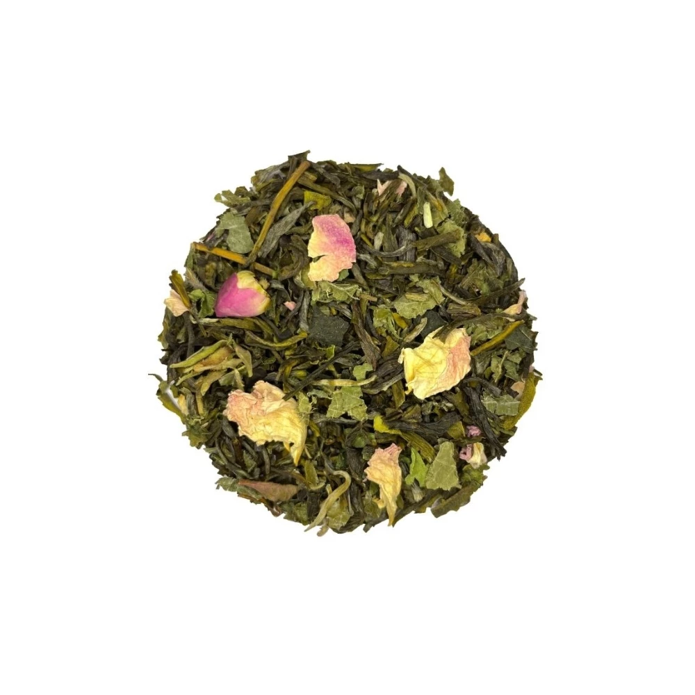 Composition de thé vert fruitée et florale, framboise agrumes et sauge bio, un thé vert féminin idéal pour un réveil en douceur et un glow parfait.