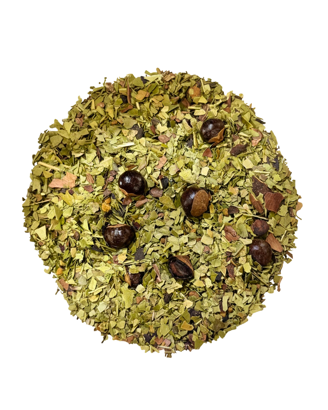 Maté, guarana, éclats de fèves de cacao, pollen de miel, arôme.