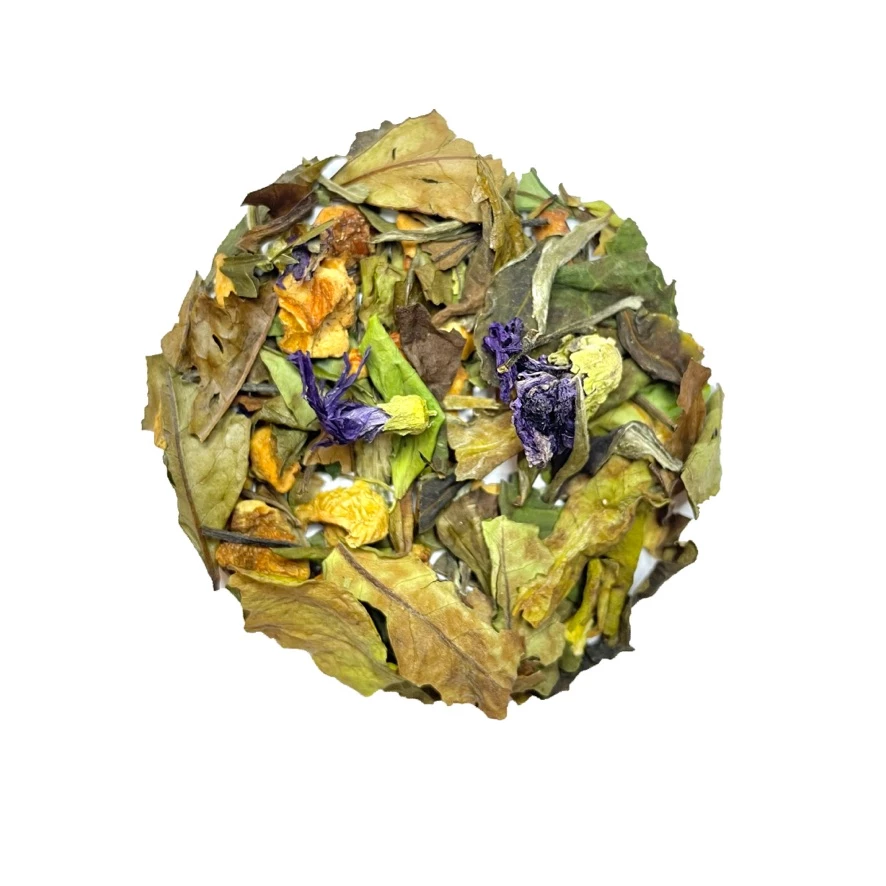 Thé blanc*, morceaux de pomme*, arôme naturel de pêche*, morceaux de pêche lyophilisées*, arôme naturel de fleur de sureau, fleurs de mauve*