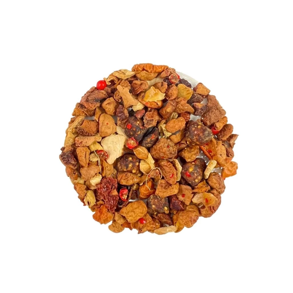 Figue*, pomme*, gingembre*, écorces d‘orange*, arôme naturel et poivre rose*
