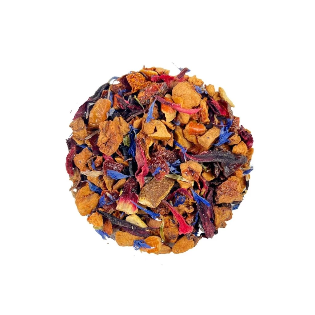Pomme*, églantier*, hibiscus*, écorces d‘orange*, arôme naturel, huile essentielle de citron*, fleurs*